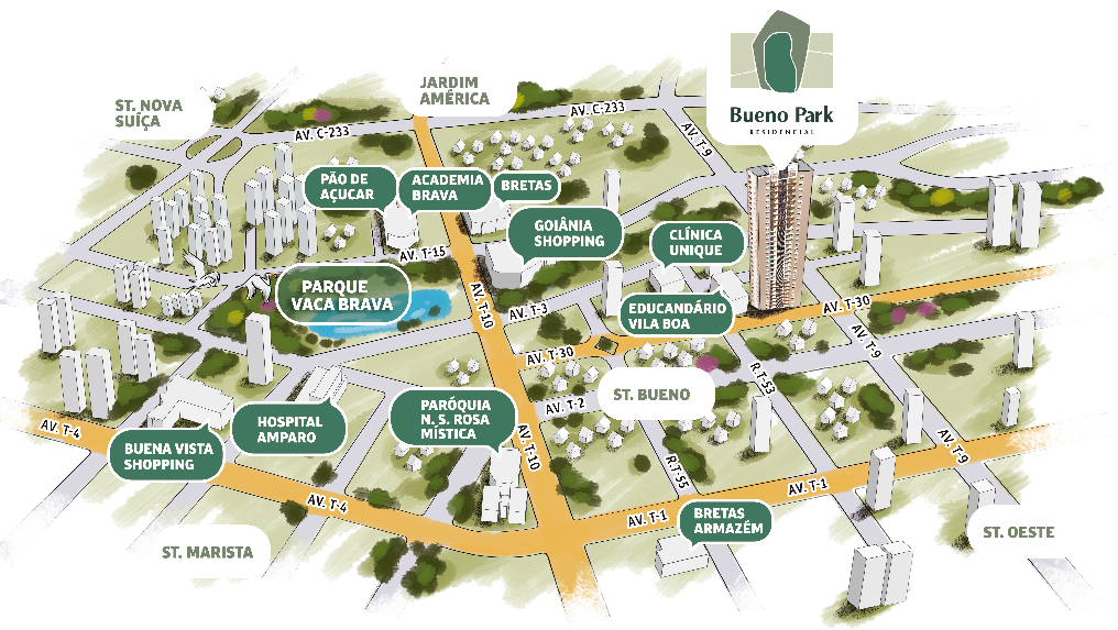More a 500 metros do Goiânia Shopping e do Parque Vaca Brava com acessos por vias de fluxo rápido. More perto dos melhores colégios, escolas, academias, bares e restaurantes de Goiânia. Perto de: Colégio Millenium; Colégio Educandário de Goiás; Classe IPOG - Instituto de pós-graduação e graduação; Colégio Simbios; Centro Educacional Omni; Faculdade Araguaia; Goiânia Shopping; Buena Vista Shopping; Supermercado Bretas; Supermercado Pão de Açúcar; Padoca Casa de Pães; Della Express; Academia Athletics; Academia Smart Fit; Brava Academia; Restaurante Cateretê; Outback Steakhouse; Bar Chopp Brahma; Bolshoi Pub; Empório Piquiras; Hospital Amparo; Hospital São Domingos; Le Touche Salão de Beleza; Praça T-55; Parque Vaca Brava.