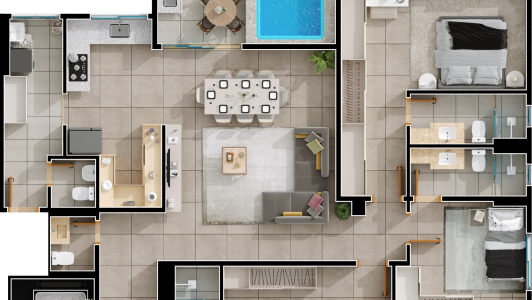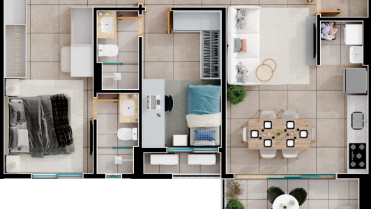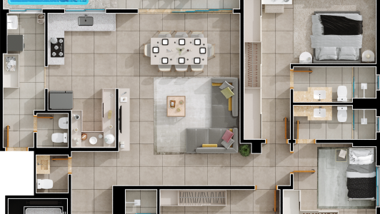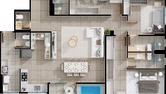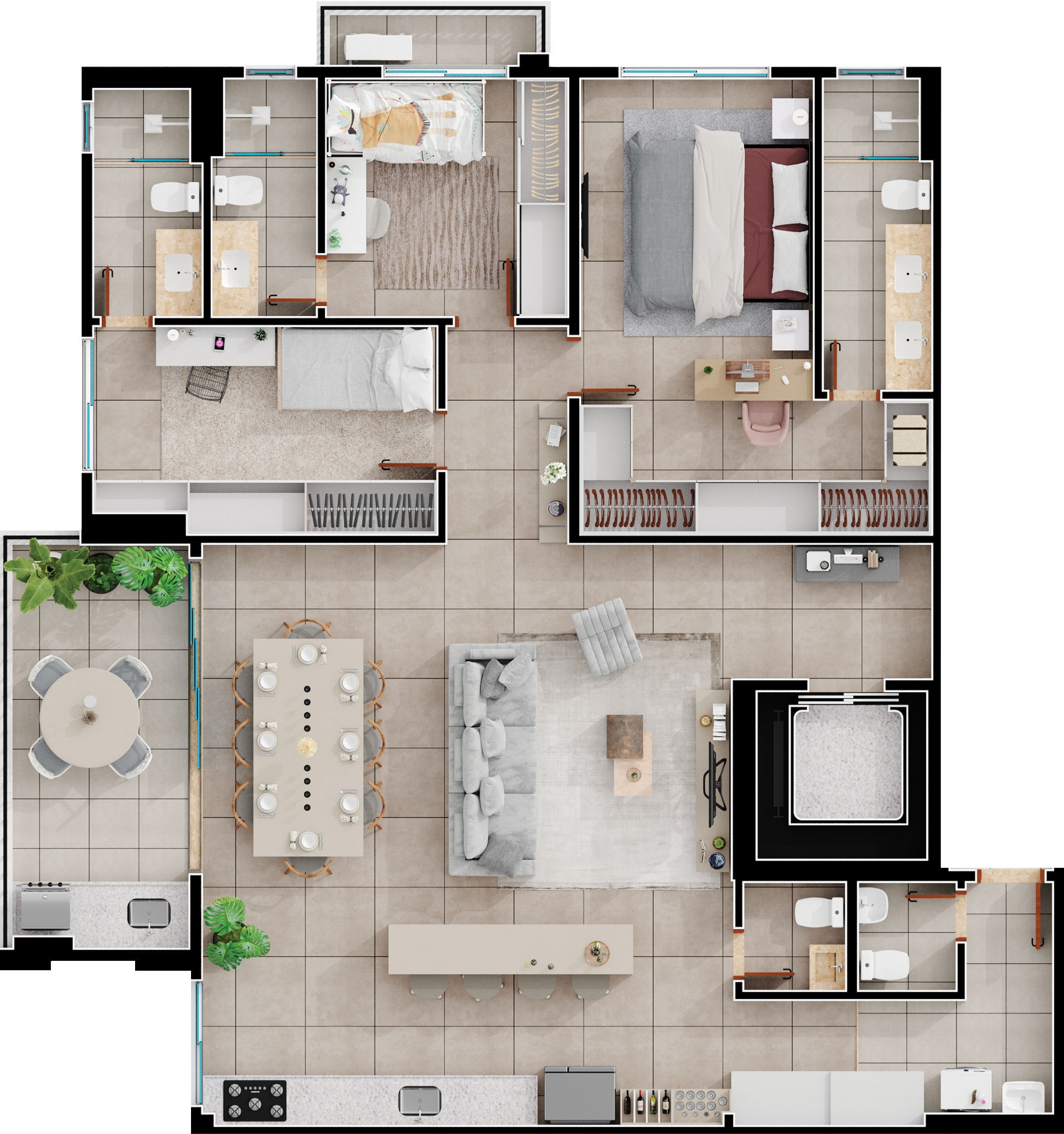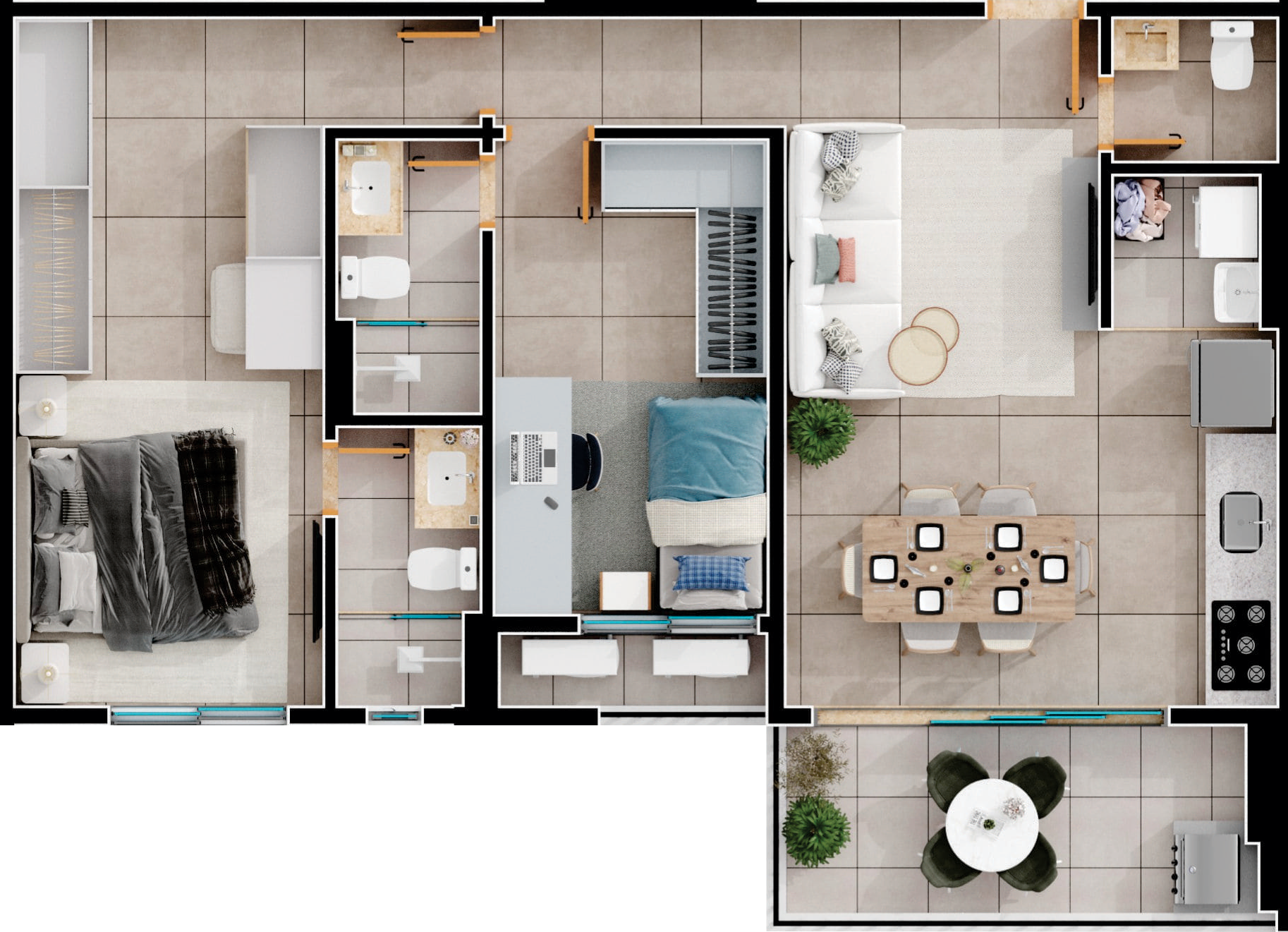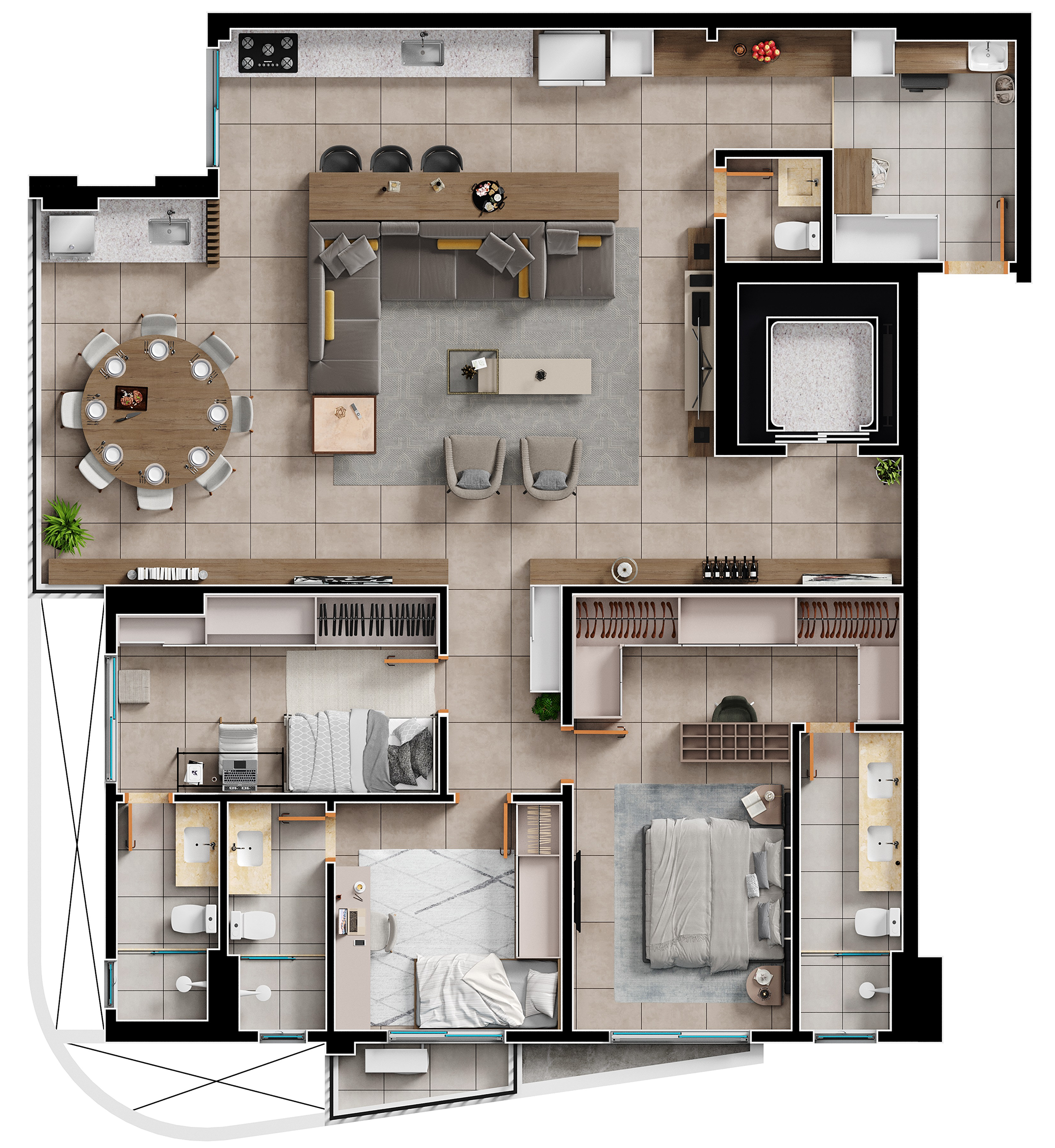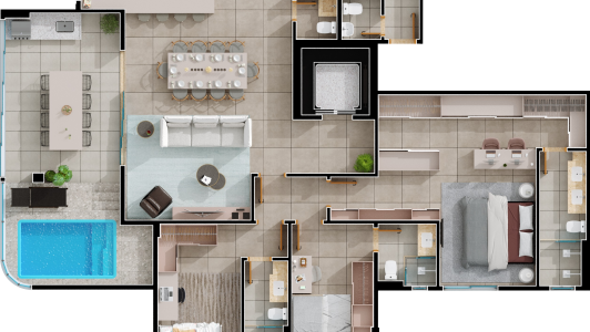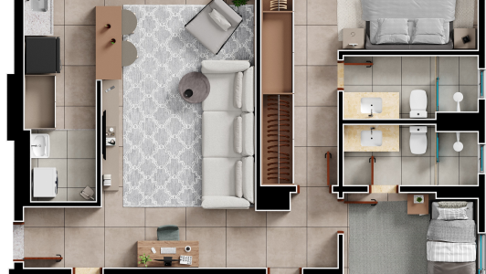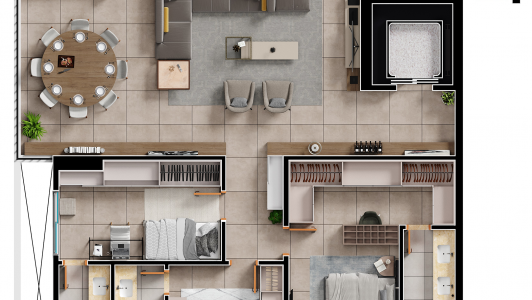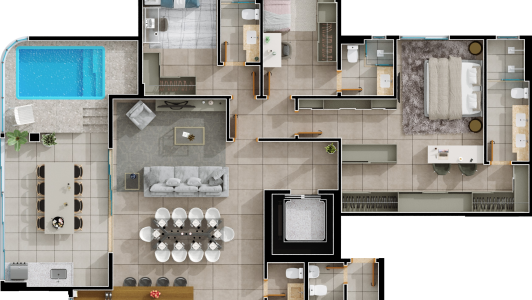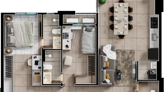 Área mobiliada e entregue segundo memorial descritivo. A CMO Construtora se reserva o direito de corrigir eventuais erros. Imagens e perspectivas meramente ilustrativas.