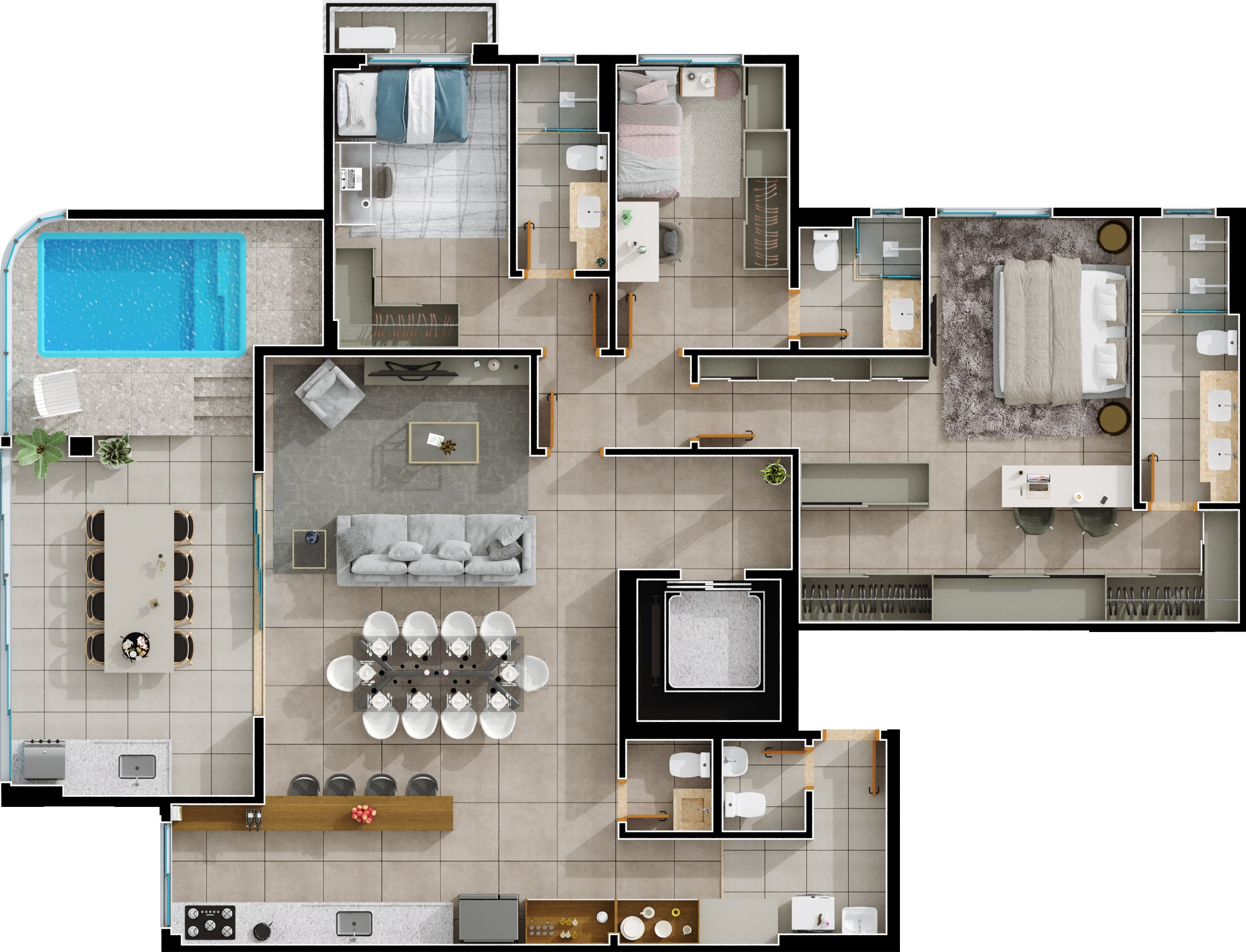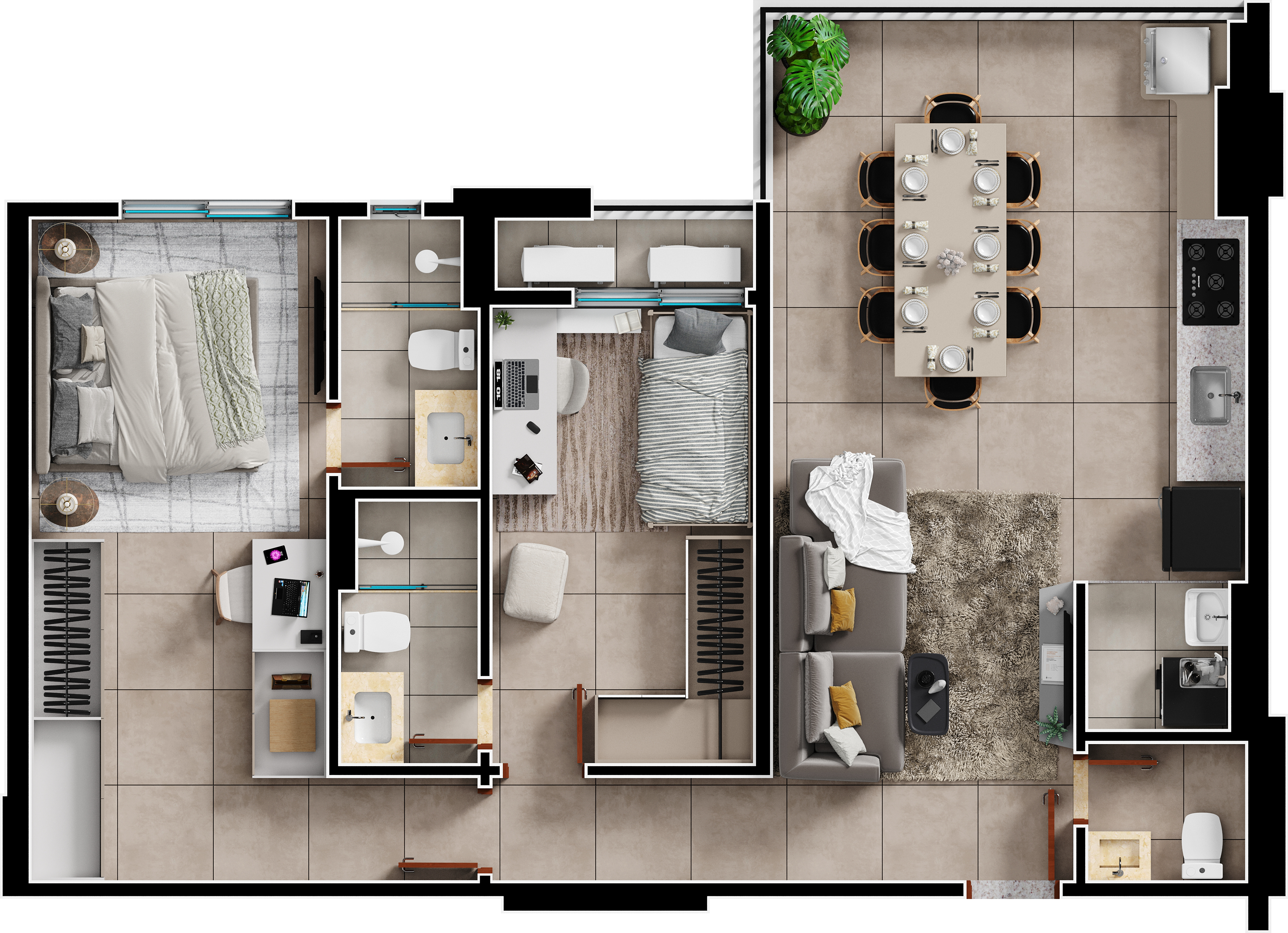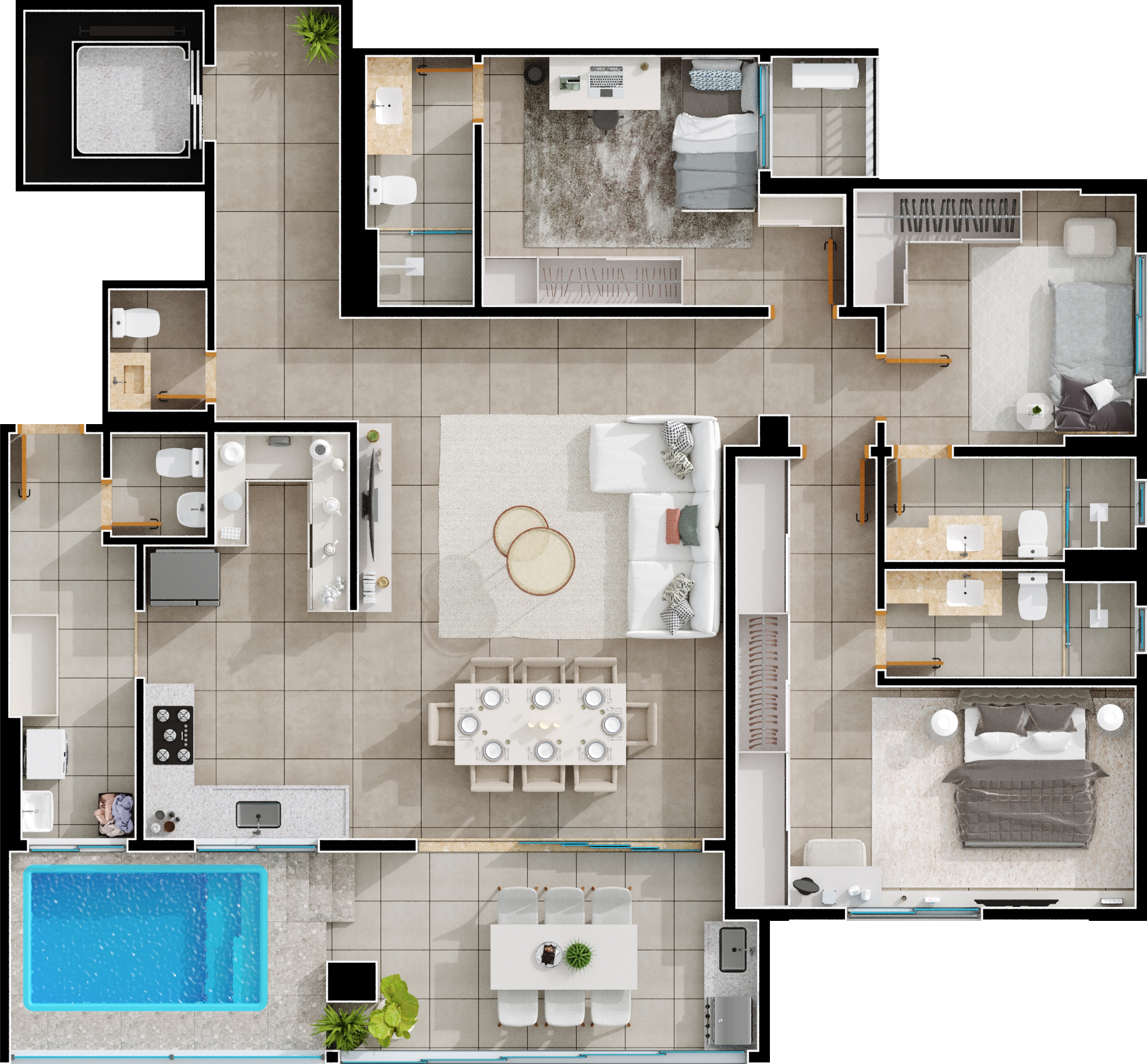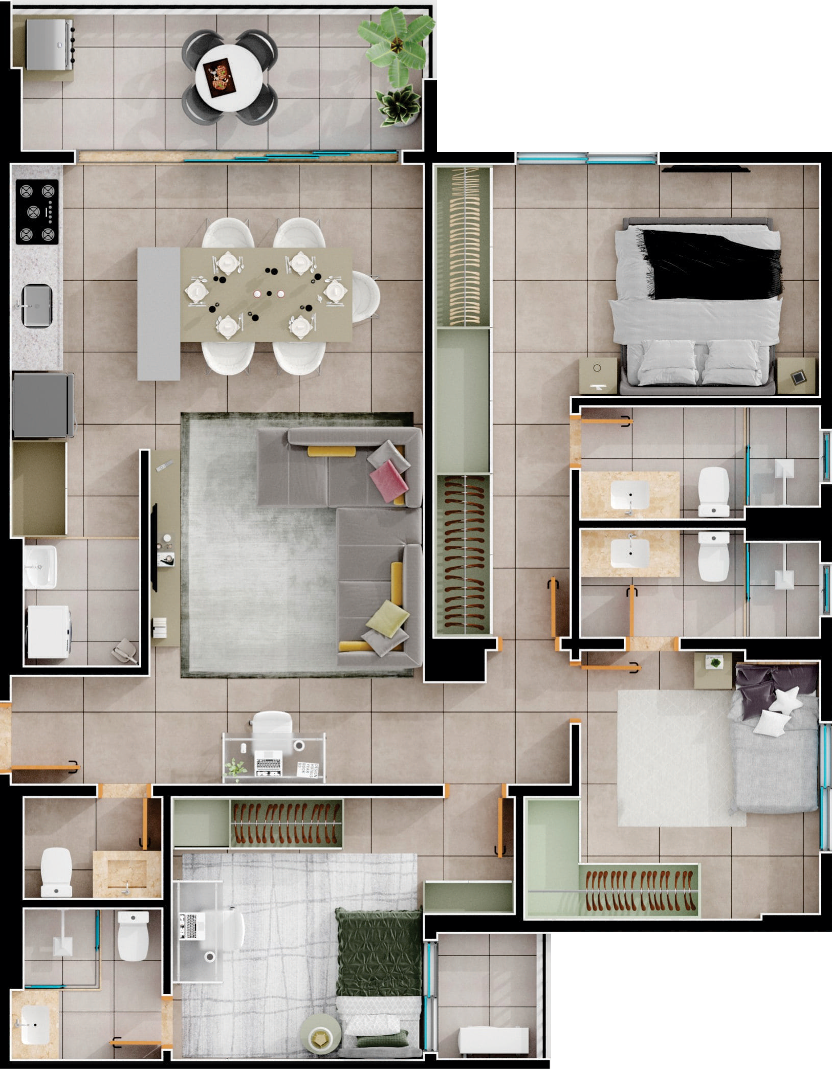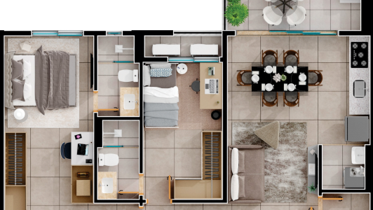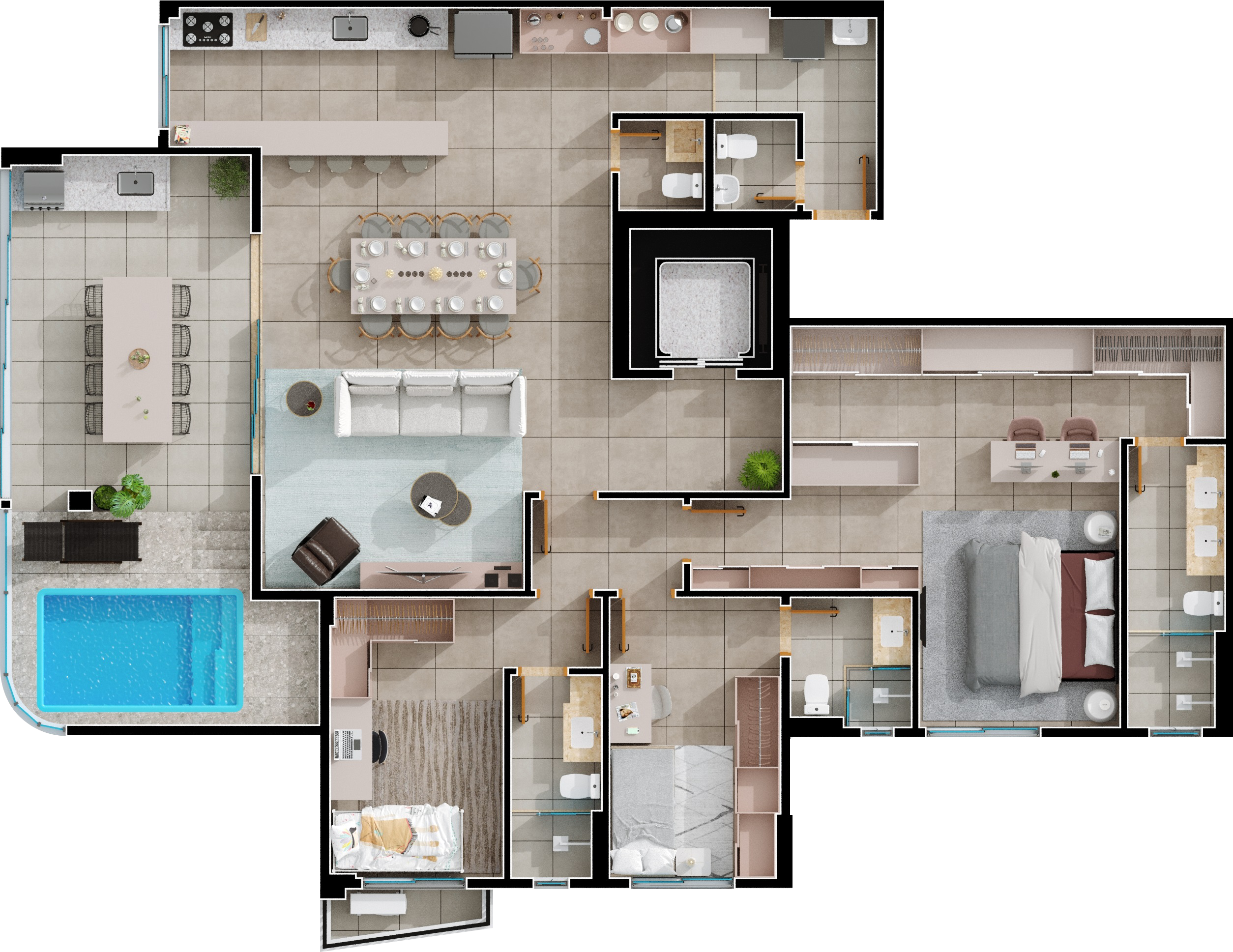 Área mobiliada e entregue segundo memorial descritivo. A CMO Construtora se reserva o direito de corrigir eventuais erros. Imagens e perspectivas meramente ilustrativas.